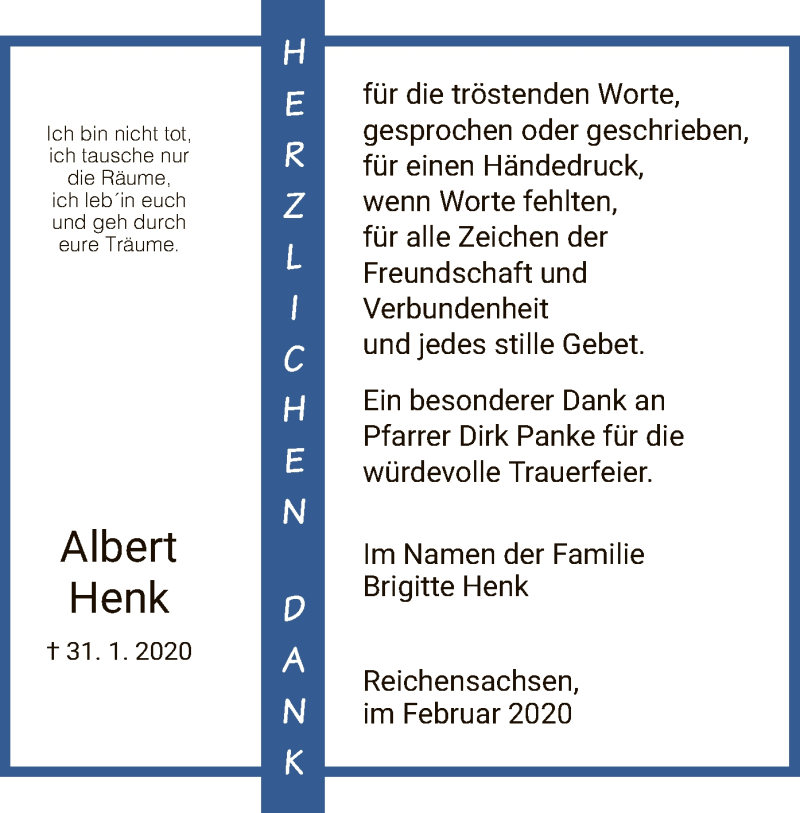 Hier finden Sie alle Traueranzeigen aus der Zeitung, die bisher für Albert Henk erschienen sind. Weitere Traueranzeigen, die in der Zeitung erscheinen, werden hier ebenfalls aufgelistet
