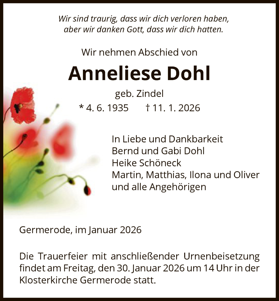 Hier finden Sie alle Traueranzeigen aus der Zeitung, die bisher für Anneliese Dohl erschienen sind. Weitere Traueranzeigen, die in der Zeitung erscheinen, werden hier ebenfalls aufgelistet