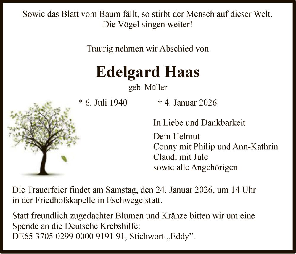 Hier finden Sie alle Traueranzeigen aus der Zeitung, die bisher für Edelgard Haas erschienen sind. Weitere Traueranzeigen, die in der Zeitung erscheinen, werden hier ebenfalls aufgelistet