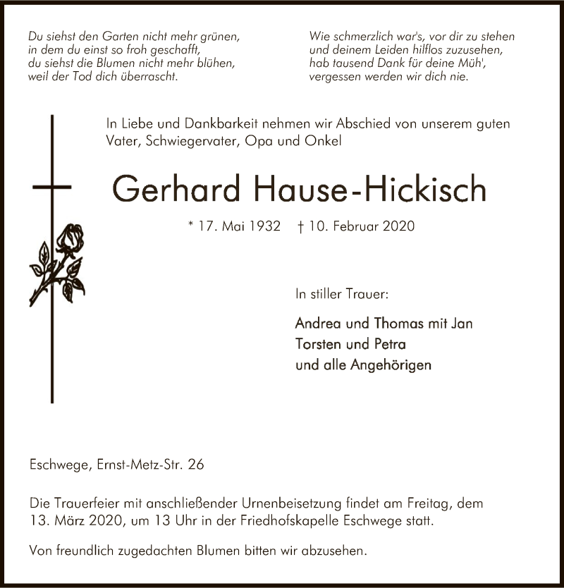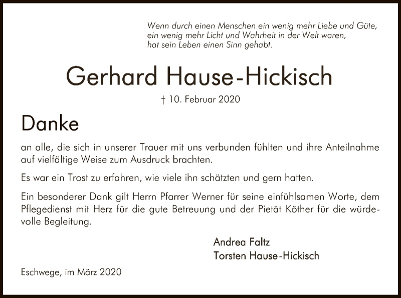 Hier finden Sie alle Traueranzeigen aus der Zeitung, die bisher für Gerhard Hause-Hickisch erschienen sind. Weitere Traueranzeigen, die in der Zeitung erscheinen, werden hier ebenfalls aufgelistet
