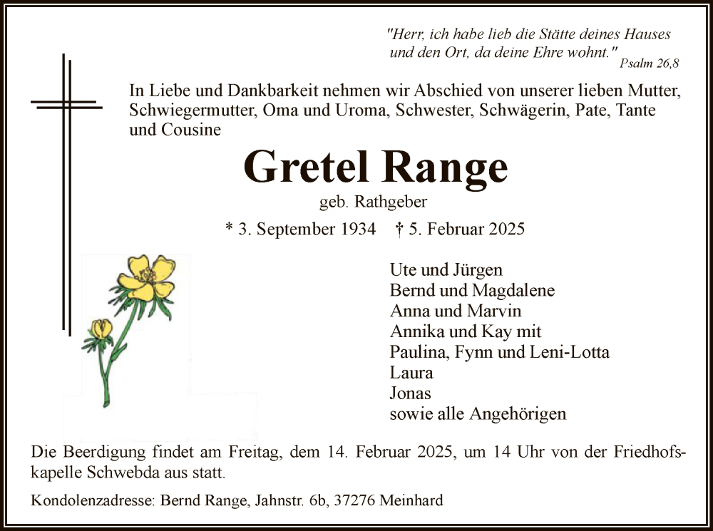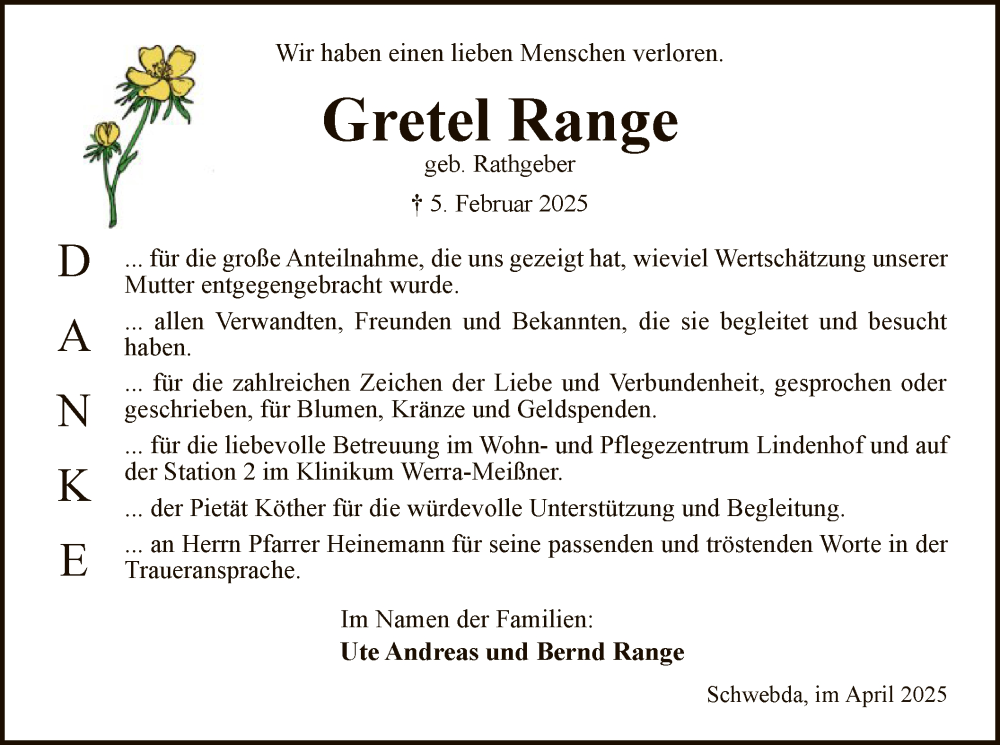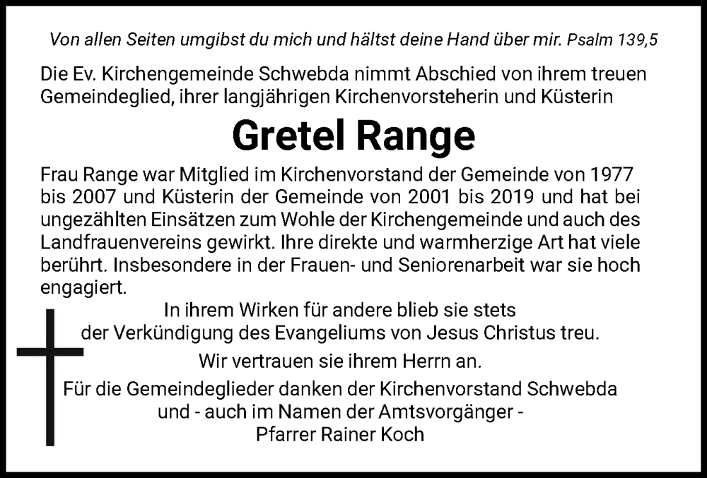 Hier finden Sie alle Traueranzeigen aus der Zeitung, die bisher für Gretel Range erschienen sind. Weitere Traueranzeigen, die in der Zeitung erscheinen, werden hier ebenfalls aufgelistet