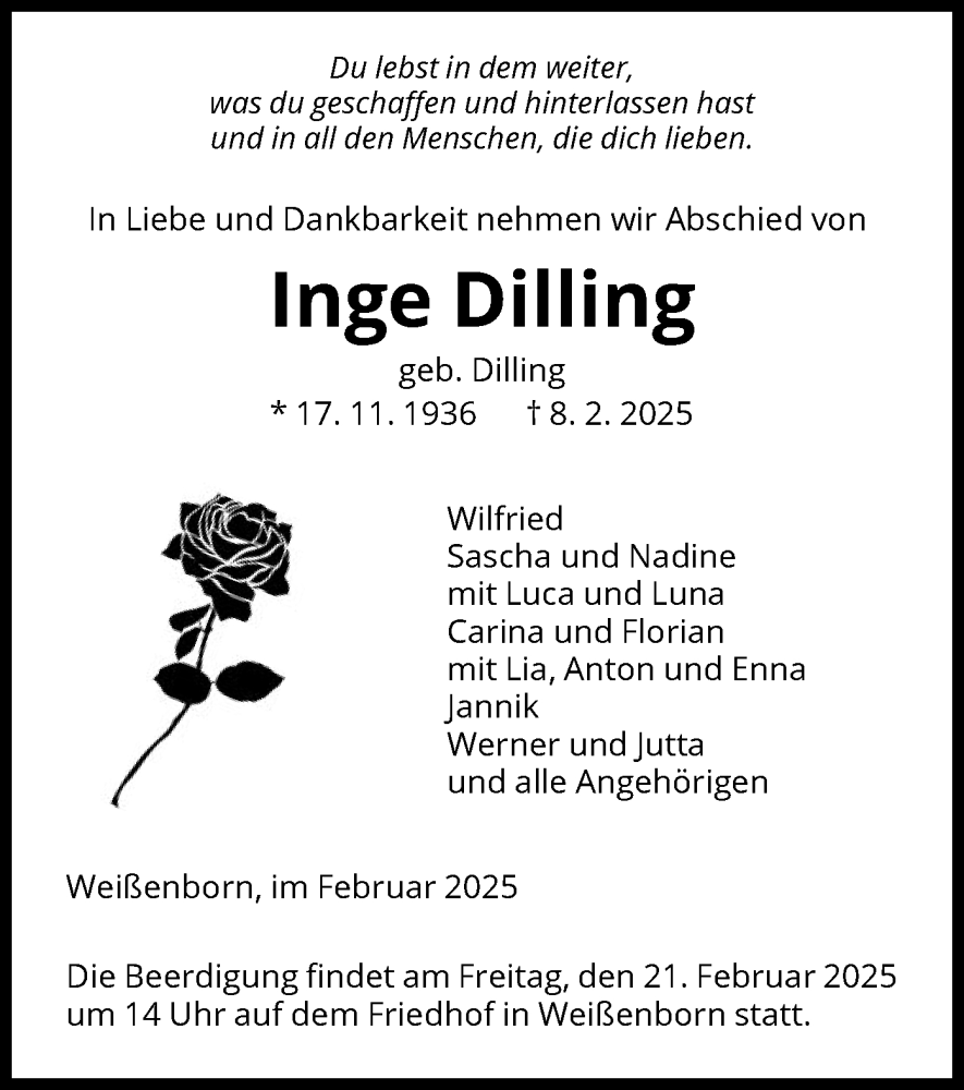 Hier finden Sie alle Traueranzeigen aus der Zeitung, die bisher für Inge Dilling erschienen sind. Weitere Traueranzeigen, die in der Zeitung erscheinen, werden hier ebenfalls aufgelistet