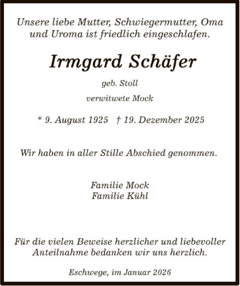 Hier finden Sie alle Traueranzeigen aus der Zeitung, die bisher für Irmgard Schäfer erschienen sind. Weitere Traueranzeigen, die in der Zeitung erscheinen, werden hier ebenfalls aufgelistet