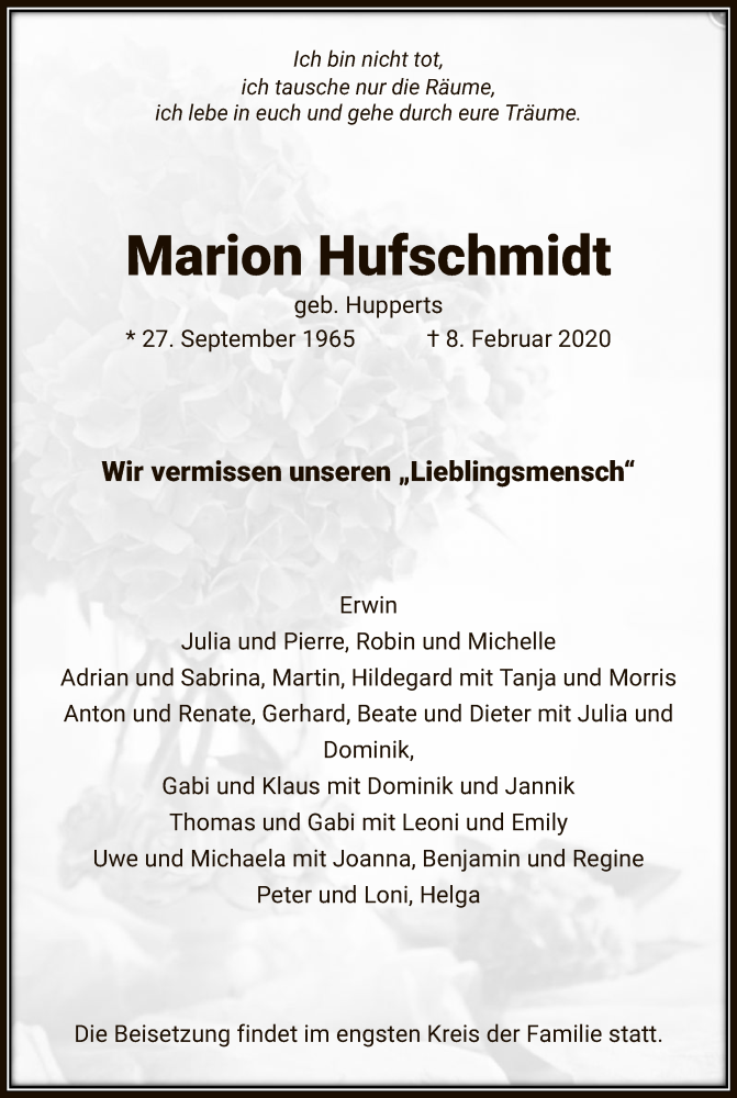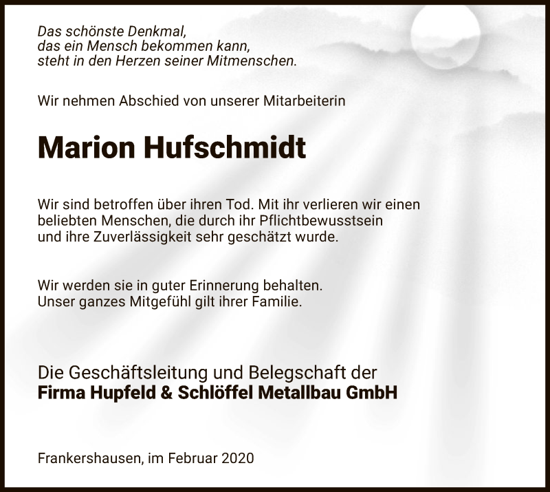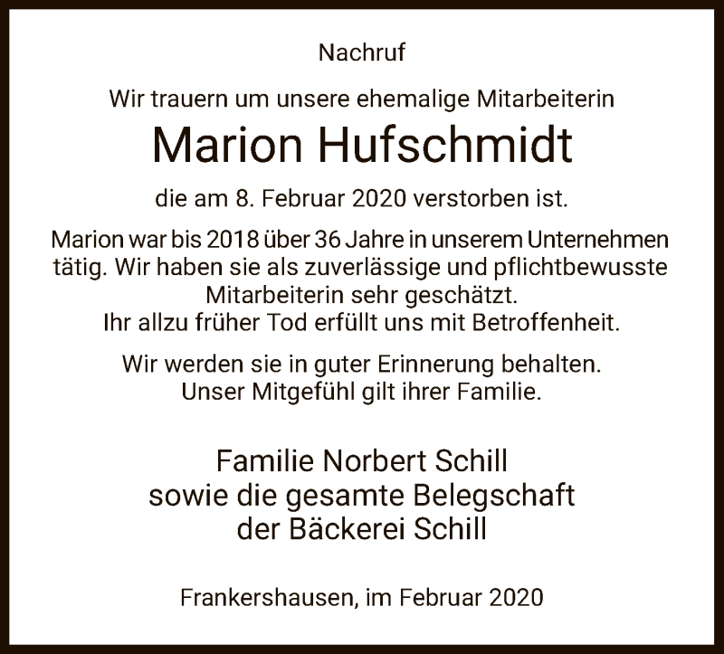 Hier finden Sie alle Traueranzeigen aus der Zeitung, die bisher für Marion Hufschmidt erschienen sind. Weitere Traueranzeigen, die in der Zeitung erscheinen, werden hier ebenfalls aufgelistet